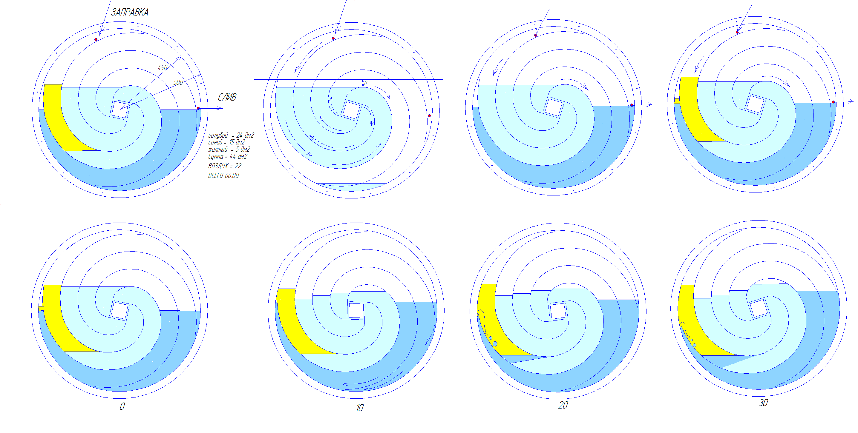 | VALERA_SNAKE, на мой взгляд, не все логично в Вашей схеме заливки. Воздух, я думаю, не даст заполнить до указанного Вами уровня те каналы с правой стороны бочки, в которых нет отверстий для выхода воздуха. Результат заливки в использованием всего двух отверстий, по моему мнению, будет такой: