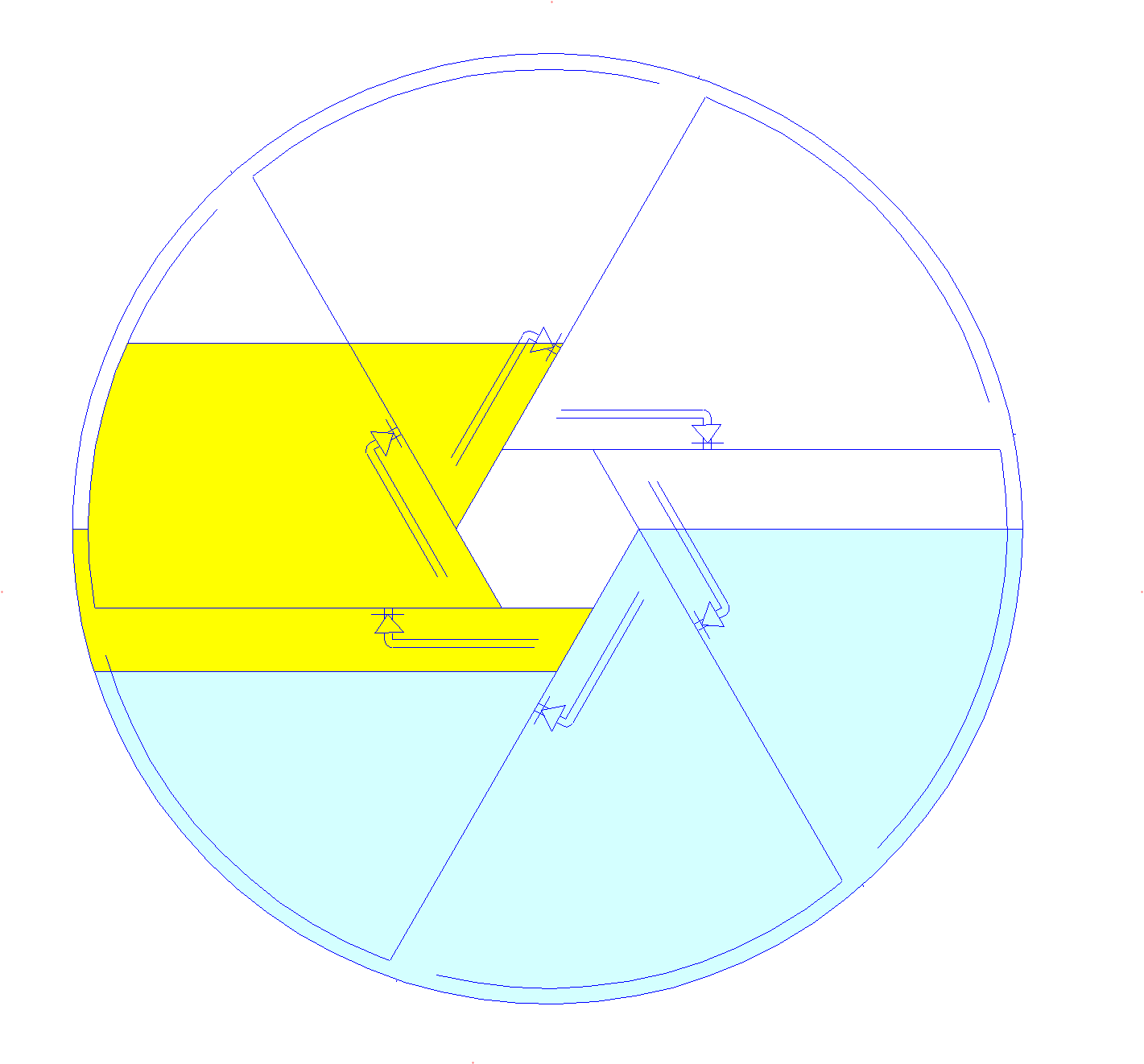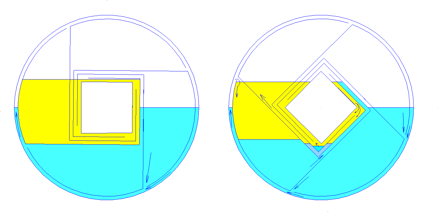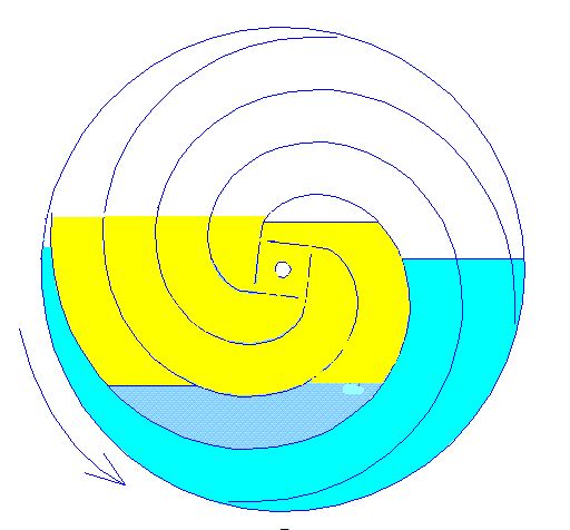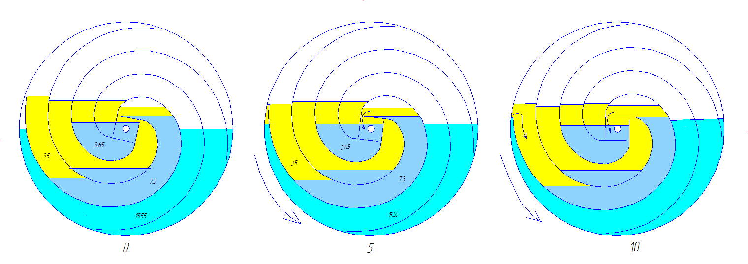 | Немного исправил. Убрал лишнюю воду. Есть аксиома : что в сообщающихся сосудах уровни разных по плотности жидкостей относятся пропорционально их плотностям. Пока вода и масло разделены перегородкой (слева), они не являются сообщающимися. После поворота когда и вода и масло соеденятся выше перегородки масло не может быть с водой на одном уровне. Оно должно приподняться, для этого вода справа через сопло слева льется в масло и тонет в нем. пока масло не поднимется на нужный уровень. наполнить нужно только один канал. так что трёх которые справа хватит по объёму . уровень воды приподнялся, и слева и справа. Вода во втором канале снизу давит масло к центру, там масло дальше идет через центр как в водоналивном колесе. Воды больше не надо. Она практически стоит на месте , перетекая по нижним каналам.