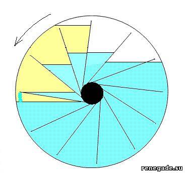 | Итак продолжим, начало в посте 3835 и несколько выше. Для тех кто только начал, повторюсь: 1) Рассматривается конструкция взятая со скифа, ссылки указаны выше. 2) От Gravio сие или нет судить не берусь... 3) В посте 3835 я пришел к выводу, что в указанной конструкции наличиствуют различные недомолвки и ловушки, что вполне естественно. 4) Цель сией писанины попробовать сообща разобраться в заковыках. Если такое возможно... 5) В данной конструкции не должно быть никаких нарушающих Природу явлений. 6) На мой взгляд в данной конструкции используется отличнейшее знание и понимание законов гидравлики, гидростатики (ну или как кто любит классической механики) В данном посте рассмотрим вариант когда трубка снизу,но раструб смотрит вверх. 1)Уровни заполнения бочки те же что и в посте 3835. 2)Вращение против часовой стрелки. Что мы видим. При отпускании конструкции со стопора часть воды быстро перетекает по "широкому каналу", образованному ободом колеса и концами лопастей. В верхней части заполненных лопастей произойдет слив воды вправо, однако на меньший уровень, чем если бы раструб трубки был направлен вниз. В левой части колеса более мощные потоки воды по широкому каналу не дадут (напорная струя послужит дном) вылиться жидкости через труб вниз. Что само по себе хорошо, но... Провернувшись на диапазон углов от 1/9 до 2/9 части окружности, колесо остановится. Ибо ОПЯТЬ же мы наступили на те же грабли - вода должна преодолевать противодавление столба жидкости двигаясь от раструба трубы к началу ее. И получается впихнуть невпихуемое. Видим, что на наполнение следующих подступивших секторов необходимо затратить энергию на преодоление сопротивления наличиствующего там уже слоя жидкости. Нарушается простой закон - тело в своем движении стремится к центру Земли. Вывод: 1)Данный вариант является "нами искусственно синтезированным" , не имеющим ничего общего с реальным устройством. 2)В такой конфигурации (трубка снизу, раструб вверх) конструкция не работоспособна.