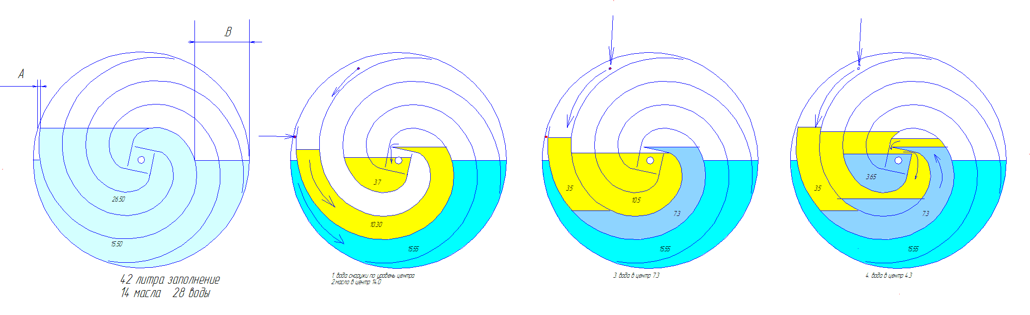 | Доброго дня. 2 aleksvyk Я думаю что народная работает немного по другому. Рис1. Отношение воды к маслу 2 к 1. При повороте на градусов 10. справа поднимается вода, и создает фонтан слева в обводном канале. Масло через клапан прорывается в верхнюю полость. Задача подобрать отношение площади канала и площади поверхности воды вправа так, что бы фонтан в движении работал даже под небольшим слоем масла. Рис 2. Есть еще вариант с клапанами из перегородок. Там есть стрелки. Если что не понятно, спрашивайте. Я считаю что всё основано на фонтане.