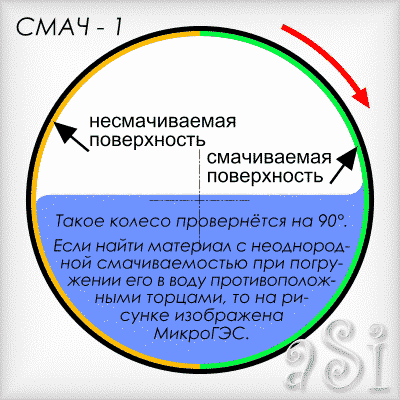 | Quote (кейси) ...там много чего интересного... Может быть. Не всё в этом списке лично мною изучено и осмыслено, но то, что осмыслено оказалось пшиком. Quote (aaasi) Я вижу другой подход. А именно: качающийся уровень. Дойдут руки - нарисую... До качающегося уровня пока руки не доходят, зато вот другая идейка - именно со стабильным уровнем. Для начала заметим, что 2,5-метровые колёса от Гравио (пока, как я понимаю, виртуальные) это всё же не МикроГЭС, а санти- или милиГЭС. Микро - это размером с компакт-диск и меньше. Вот рисунок: Материал для внутренней поверхности колеса-цилиндра должен обладать этой самой анизотропией в смысле смачиваемости. На вскидку можно предположить нечто вроде причёсанного в одну сторону ворса с капилярными свойствами. Легко представить, как молекулы воды сами карабкаются вверх по хорошо смачиваемой стороне и шарахаются от противоположной, крутя при этом цилиндр.